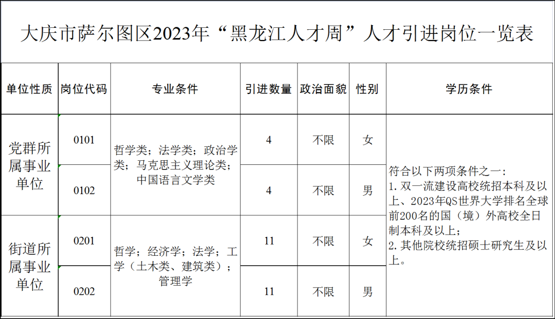 计划引进党群所属事业单位工作人员8人,街道所属事业单位工作人员22人,具体引进岗位、数量要求详见《萨尔图区2023年“黑龙江人才周”人才引进岗位一览表》(见附件)。