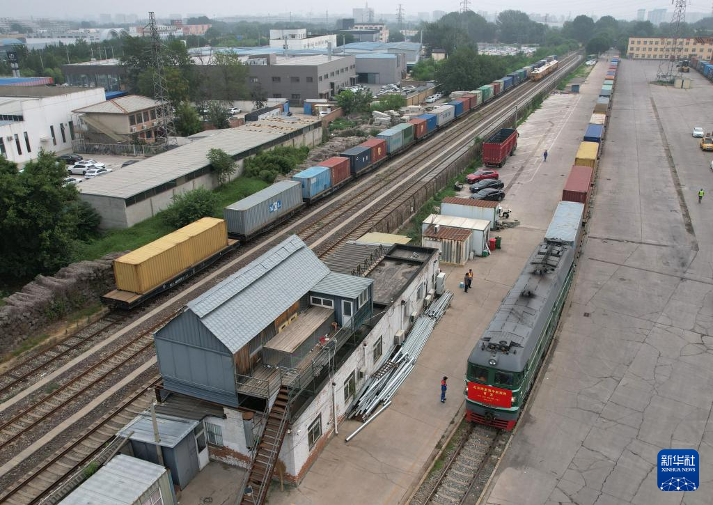 6月30日,北京至阿塞拜疆巴库的跨里海中欧班列停靠在位于北京市房山区的北京国际陆港等待发车(无人机照片)。